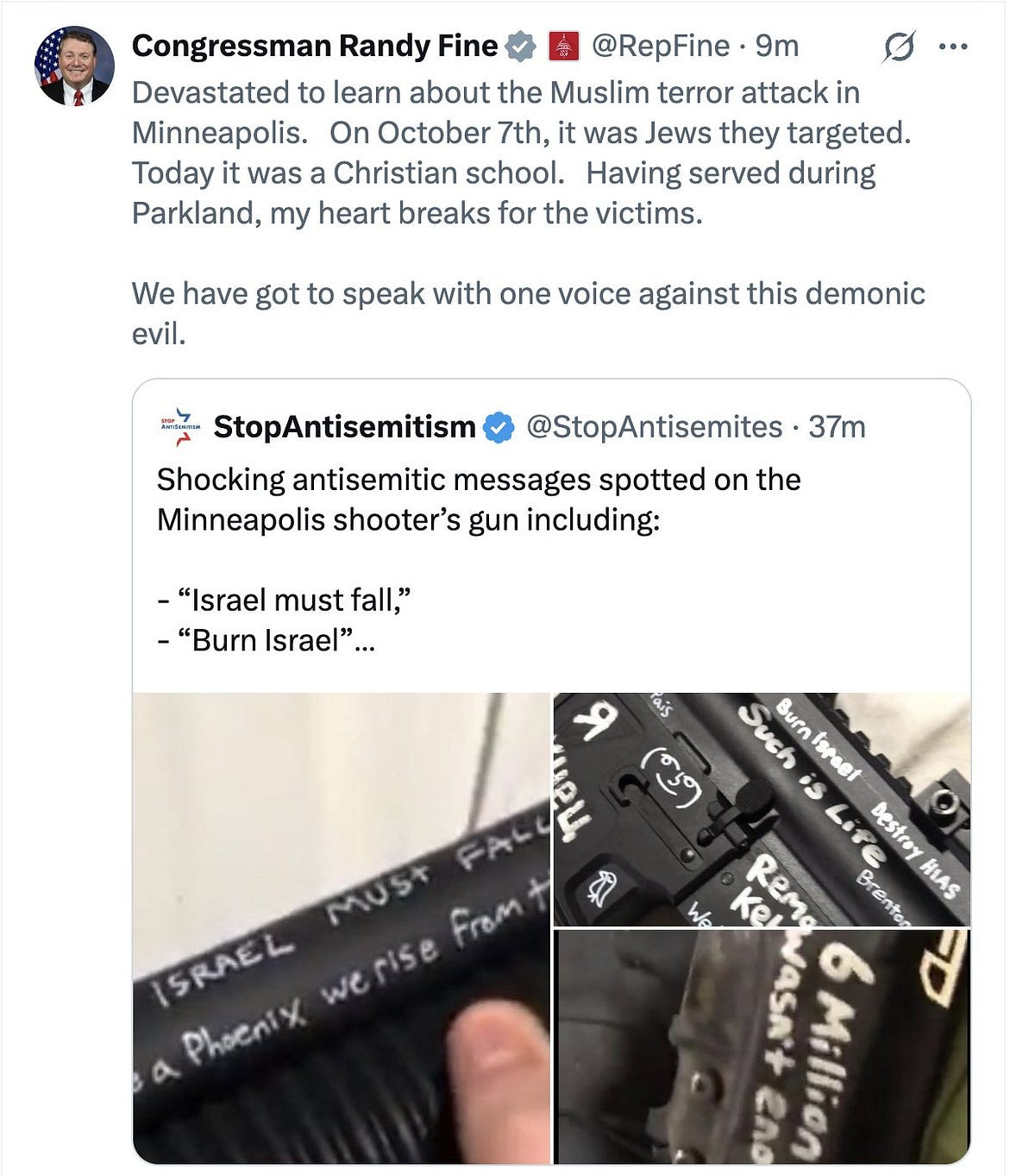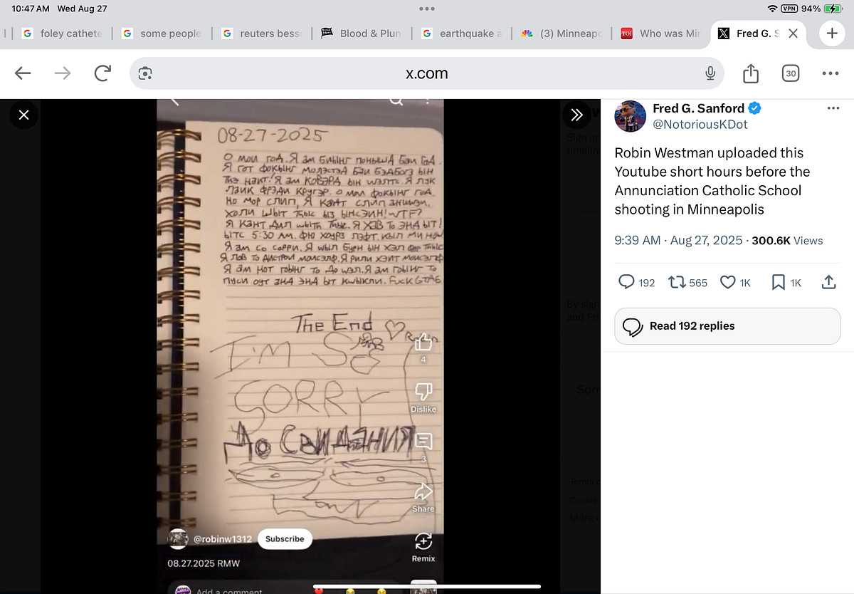 * Having gone through some of this material, including all 11 minutes of video, we are dealing with a very mentally ill individual with access to guns. Motive? It's not clear to me. But it could come down to revenge on the school. I know, it's not satisfying, a more political angle is preferred. Was he messing with us with all the writing on the guns? I offer this as a possibility. Yesterday, another Substacker raised that possibility.