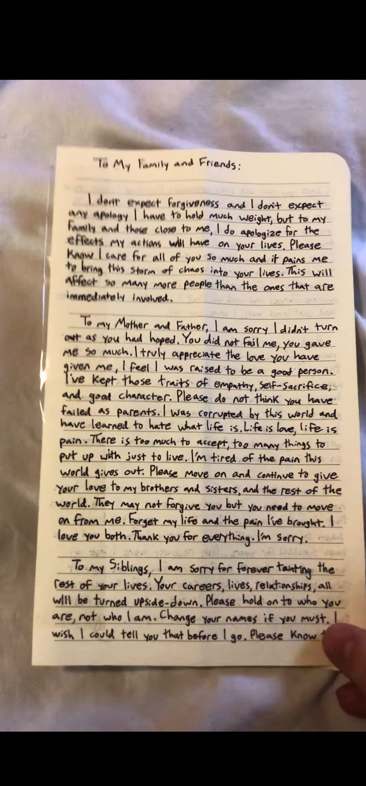 * There were two notebooks, one with a suicide note to the family, apologizing for what this was going to do to their lives, the second in a combo of phonetic English, Russian, some Greek, and code. Good luck, FBI. No, I mean it. It is unclear where he acquired the Russian. However, it could be due to Google Translate or simply copying.